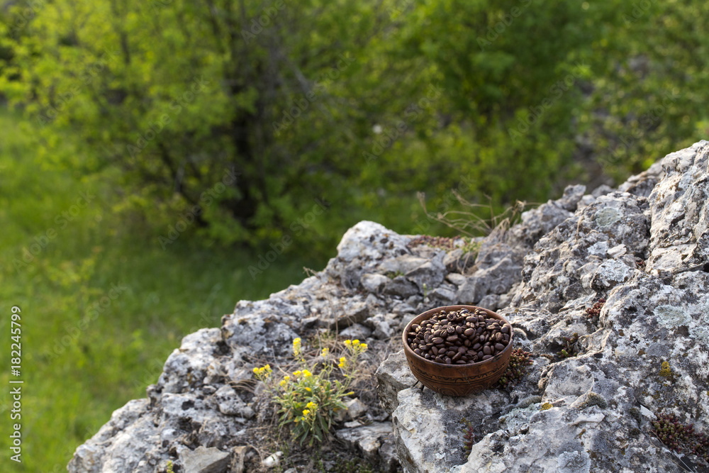 Coffee beans into ceramic bowl.