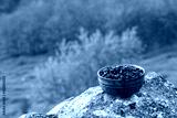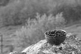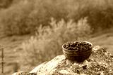 Coffee beans into ceramic bowl.