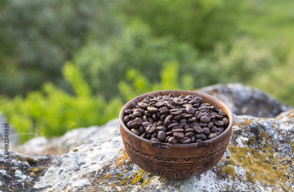 Coffee beans into ceramic bowl.