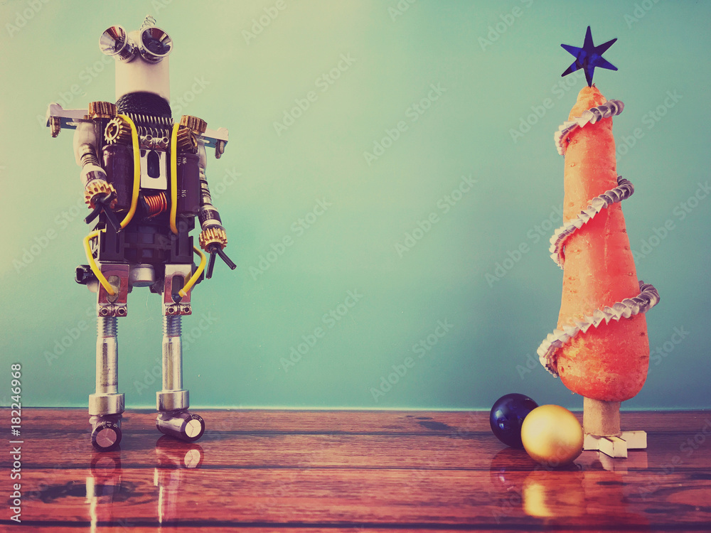 Christmas tree made of carrot with blue star and ribbon made from metal. Robot standing on left side of image. Blue retro look with empty background for text.