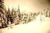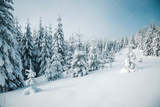 Incredibly magical snow-covered pine trees blanketed in thick white snow under a clear blue sky.