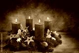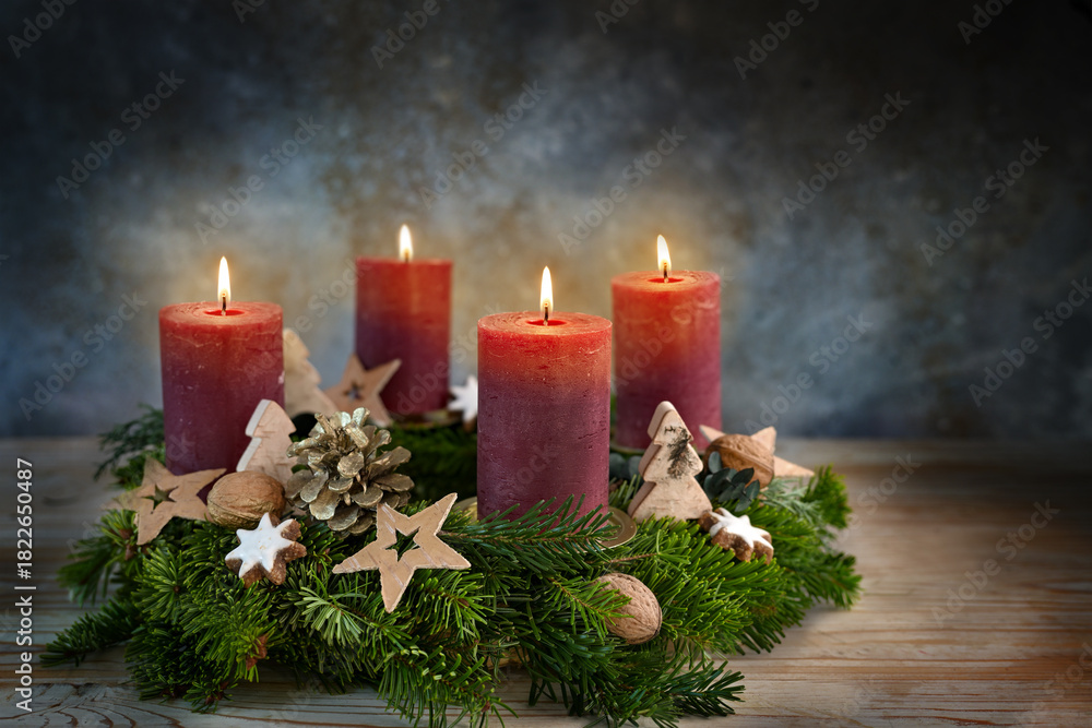 Four red candles on an Advent wreath, all are lit for the fourth advent, small stars, cookies and nuts as Christmas decoration, dark bluish background, copy space, selected focus