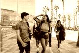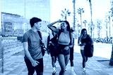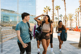 A female and male athlete walk and laugh as a group of three athletes walk behind them