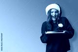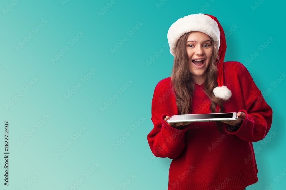 Girl in santa hat holds digital tablet Buying Christmas gifts