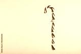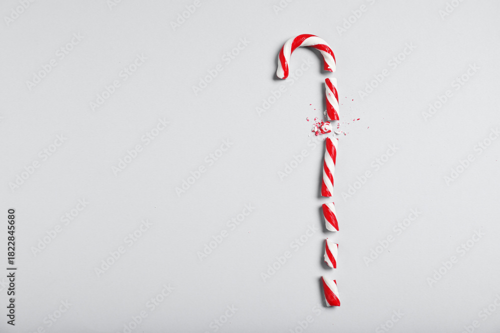 Crushed candy cane on grey background, flat lay with space for text. Christmas treat