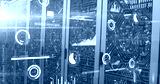 Illuminating row of server cabinets showing HUD graphics in data center, with LED indicators
