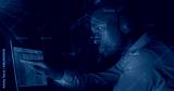 Pointing man in shirt, red headset leaning toward laptop at control desk, with shield and overlays
