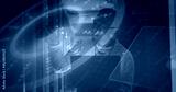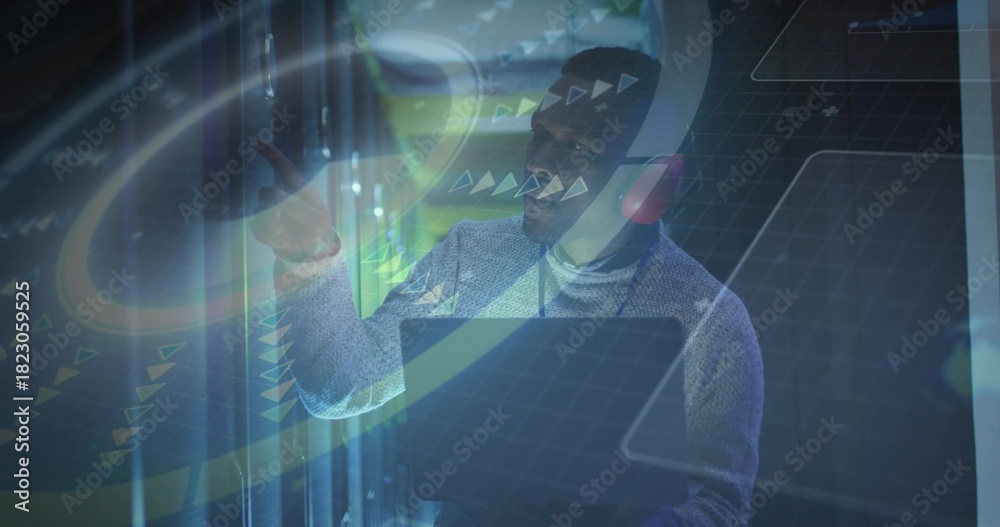Using holographic UI, man in sweater over collared shirt, AR headset and tablet near server racks