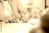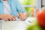 Close up hand patient writing note while nutritionist consultation using tablet to explaining personalized meal plan with AI to patient during healthcare, woman dietitian showing nutrition plan.