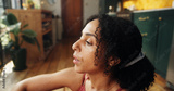 Yoga, breathing and woman in home for thinking, peace and health with calm on break. Self care, yogi and person in kitchen for holistic mindset, fitness and relax with reflection for wellness