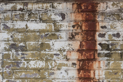Peeling white and green painted brick wall with a large band of dripping rust stains, horizontal aspect