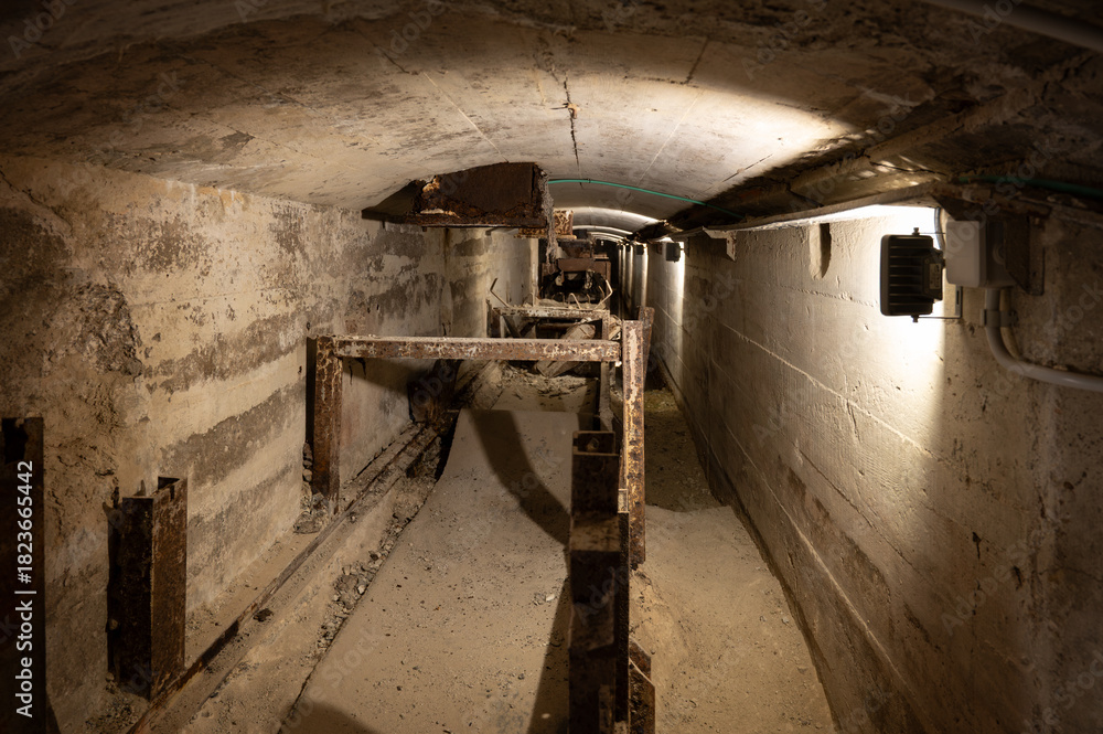 Long exposure view of a dark, abandoned cement factory tunnel showing the rusted metal framework of a defunct conveyor belt system.
