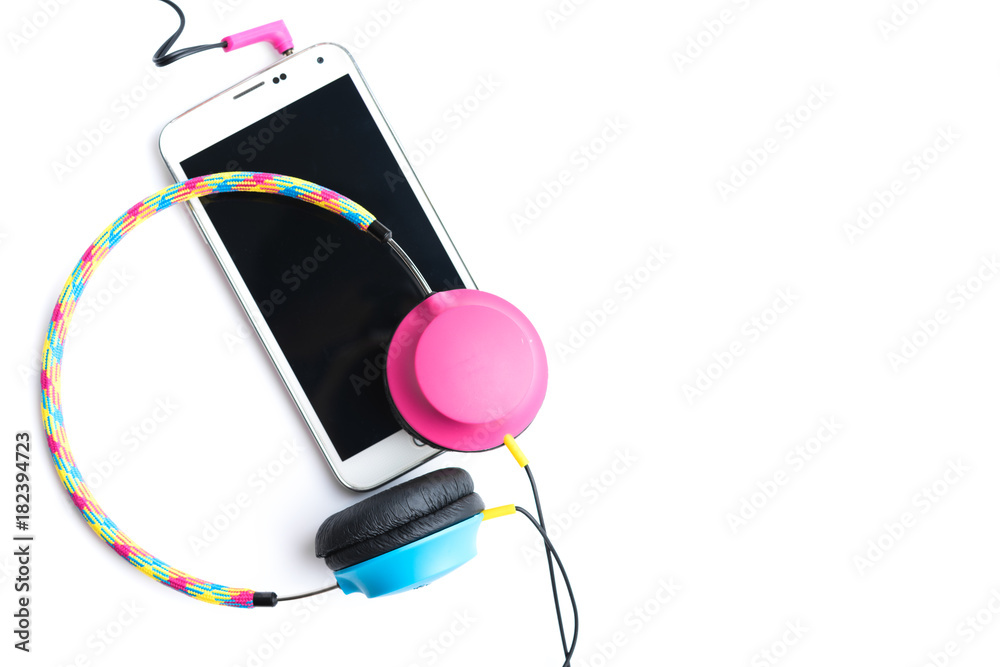 Headphones connected to smartphone isolated on white background