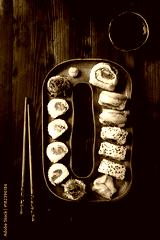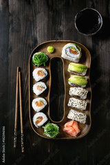 Homemade sushi rolls set with salmon, sesame seeds and avocado serving in wood plate with pink pickled ginger, soy sauce, wasabi, seaweed salad, chopsticks over dark wooden background. Top view, space