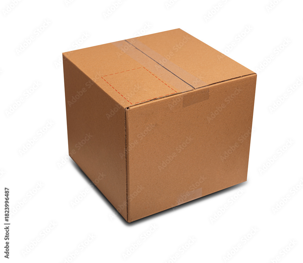 A closed brown cardboard box with a red dashed outline for a label sits isolated on a white background.