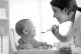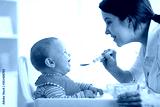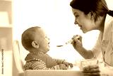 Mother spoon-feeding her child boy