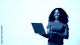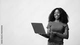 A happy young Black woman smiles while holding a laptop. She stands confidently, showcasing her cheerful demeanor against a plain background.