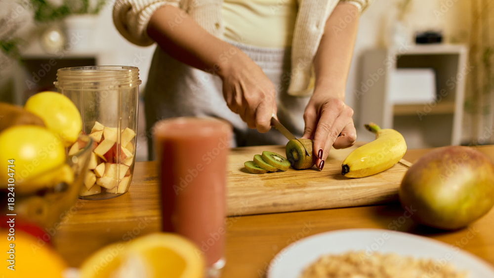 Hands slicing ripe kiwi for smoothie preparation with fruits and blender on table. Concept of recipe steps, short-form cooking videos, nutrition blogs, healthy lifestyle materials.
