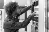 Young man using interactive touchscreen vending machine