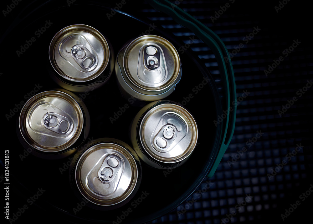 Top view of aluminum beverage cans arranged in a dark bucket or cooler