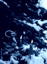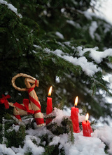 straw Yule Goat and burnig red candles in winter forest. Traditional festive decor, symbol of Scandinavian, Northern European Yule, Christmas holiday. witchcraft, magic ritual for Yuletide