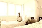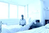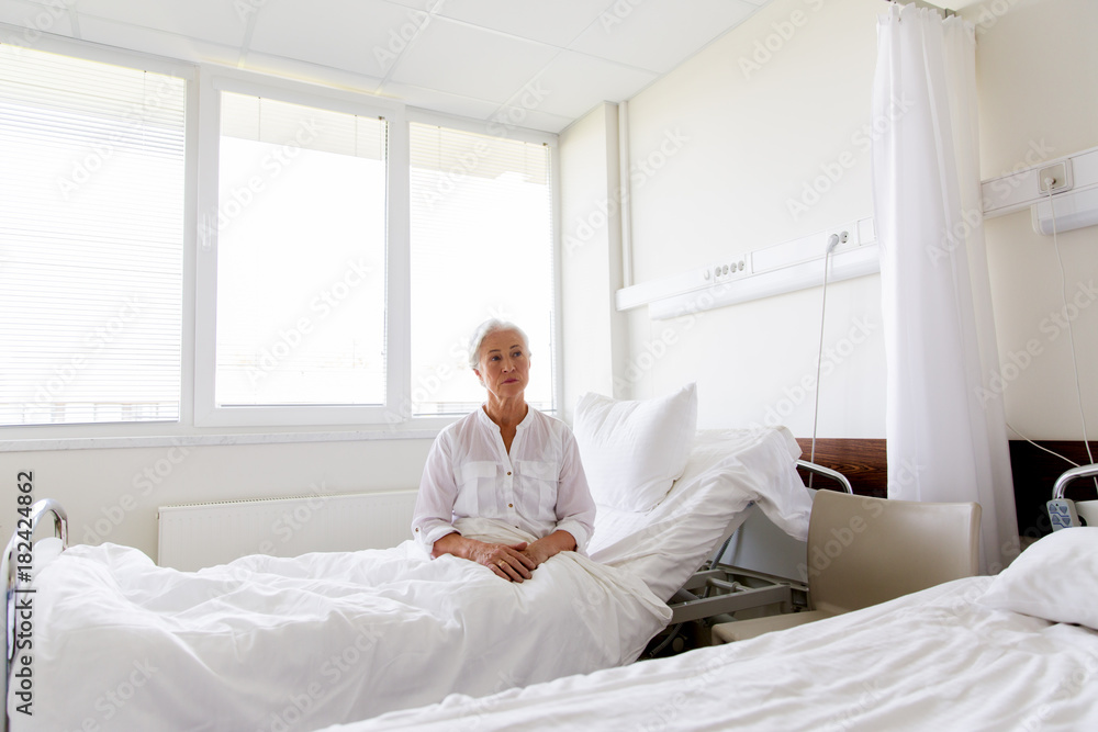 sad senior woman sitting on bed at hospital ward