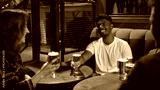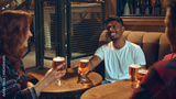 Friends chatting with beer glasses at wooden pub table. Concept of bar lifestyle content, brewery campaigns, social advertising, nightlife visuals, and relaxed drinking culture.