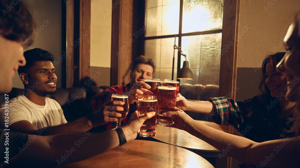 Friends raising beer glasses together at pub booth in warm scene. Concept of brewery campaigns, bar lifestyle marketing, social nightlife ads, beverage promotions, and relaxed group leisure.