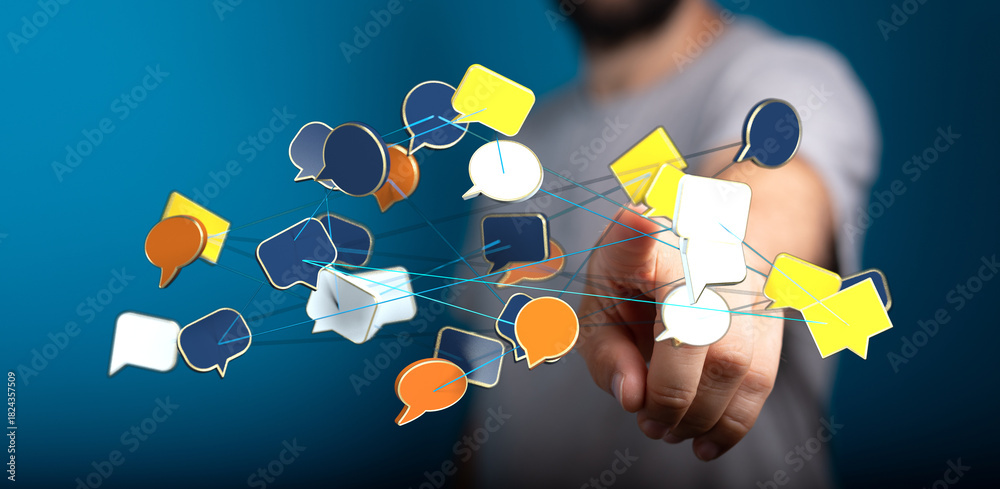 Concept of communication, digital networking and social media connectivity. Hand touching speech bubbles, repre