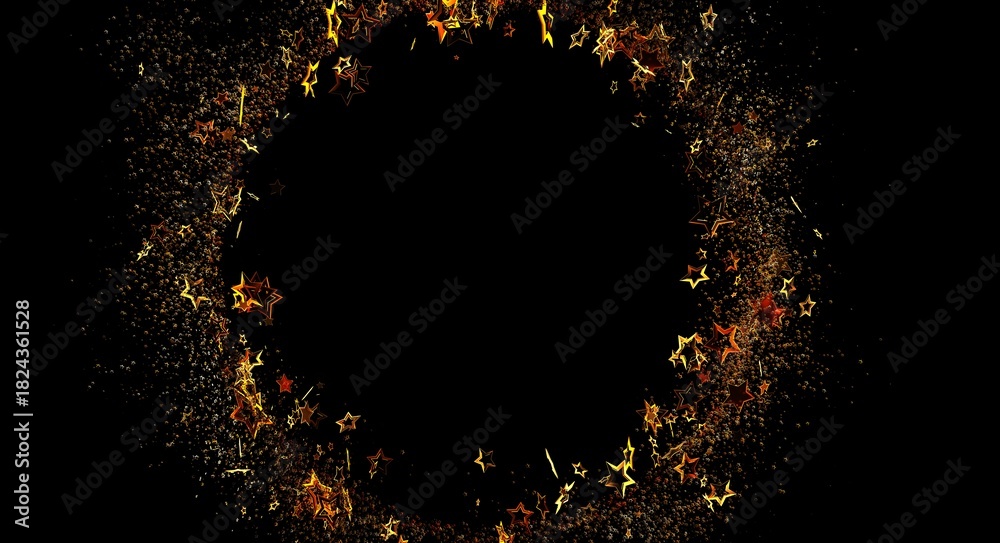 Abstract golden stars forming a circle on black. Great for backgrounds, celestial themes, and design elements. Ideal for