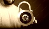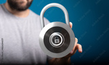 Close-up of a person holding a metallic padlock, representing security, confidentiality, and data protection, w