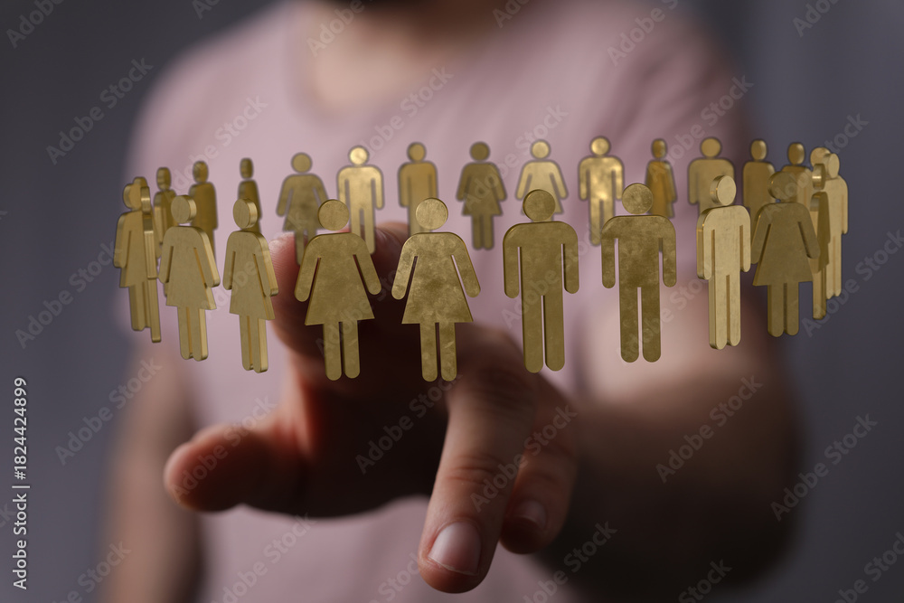 Abstract image of hand touching 3D figures representing people. Concept of unity, teamwork, and social networking. Suitable for business, commun