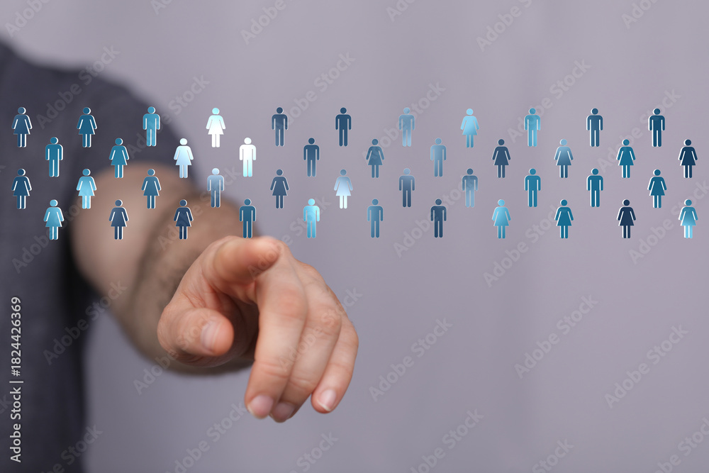 Conceptual image of a hand pointing at human silhouettes, symbolizing people, teamwork, and social networking. Illustrating the idea of connecti