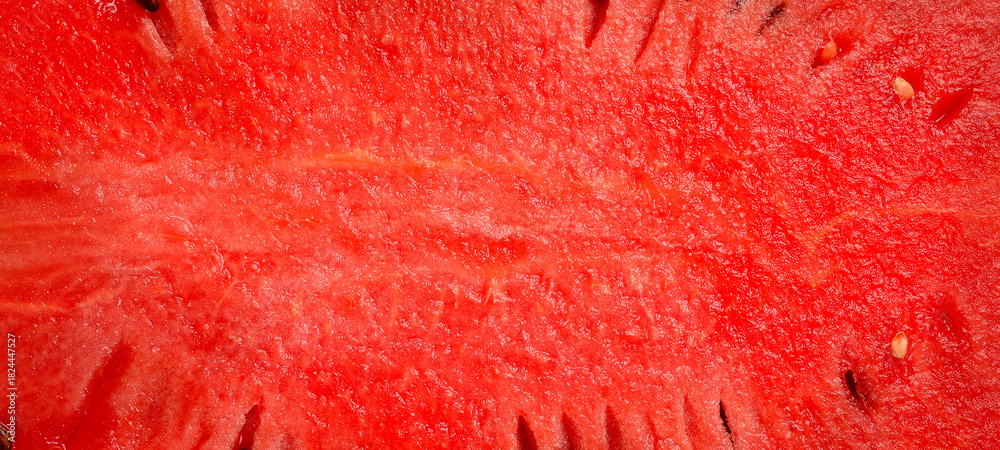 Watermelon texture, macro photo, close-up. Piece of watermelon with seeds. Top view.