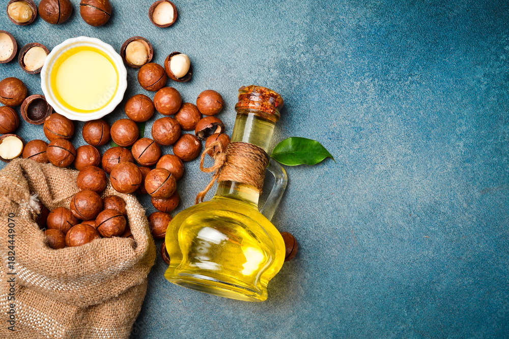 Bowl of macadamia nut oil and macadamia nuts on gray concrete background. superfood and healthy food concept, top view