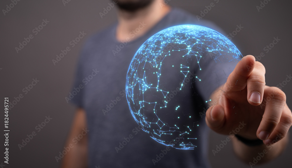 Person interacting with a glowing digital globe representing the internet, networks, and communication technologies.
