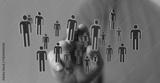 Hand reaching towards a network of connected human figures representing collaboration and teamwork. Great for b
