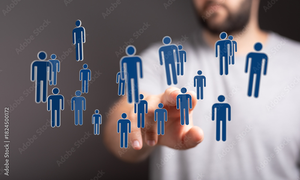 Concept of social connections, networking, or global communication shown by a man interacting with digital pers