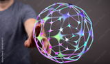 Person holding glowing 3D digital sphere representing global connection, network, and communication. Concept of technology and innova