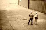 High angle view of professional logistics team discussing operations at cargo container terminal. Male and female engineers surveying shipping yard area with large copy space for text.