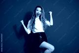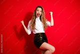 Cheerful young woman celebrates success in trendy outfit against a vibrant red background portraying glamour and joy