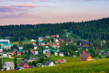 Small mountain town of Zabljak with colorful houses and rooftops nestled in forested highlands, Durmitor National park, Montenegro.