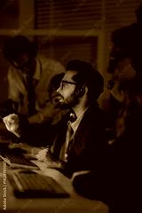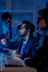 Future team lead headset guides human AI collaboration points screen AI generated insights predictive models refine strategy achieve optimal performance augmented intelligence workflow activates now b