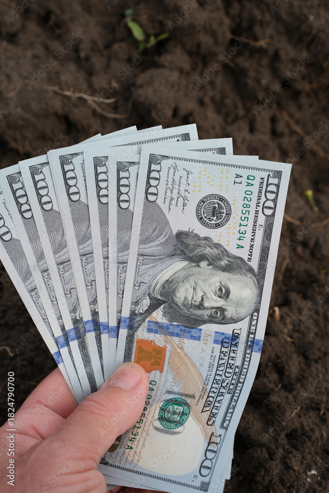 American dollars folded in a fan in a hand. Black ground background. Land market.