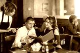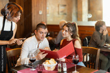 Young woman waitress takes order from couple young man and young woman in restaurant