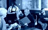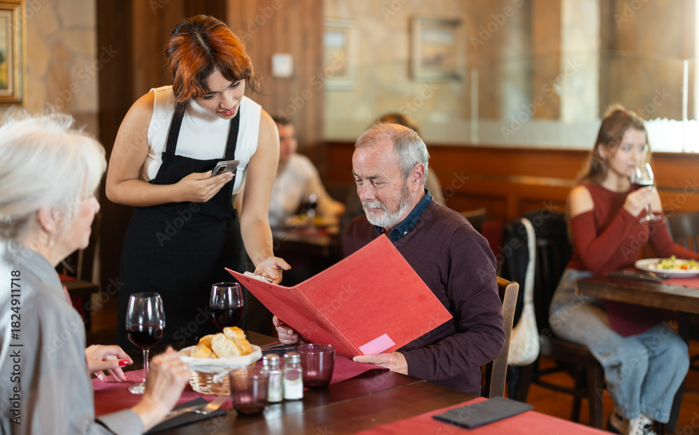 Friendly waitress recording order as senior couple dining peacefully inside warmly decorated restaurant environment