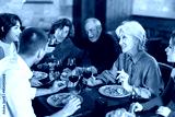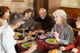 Friendly family members enjoying warm conversation over dinner in cozy restaurant