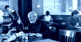 Mature couple communicate and chatting during date in cafe, have rendezvous, lovers tryst. Participants of meeting get to know each other, joke and communicate during meeting