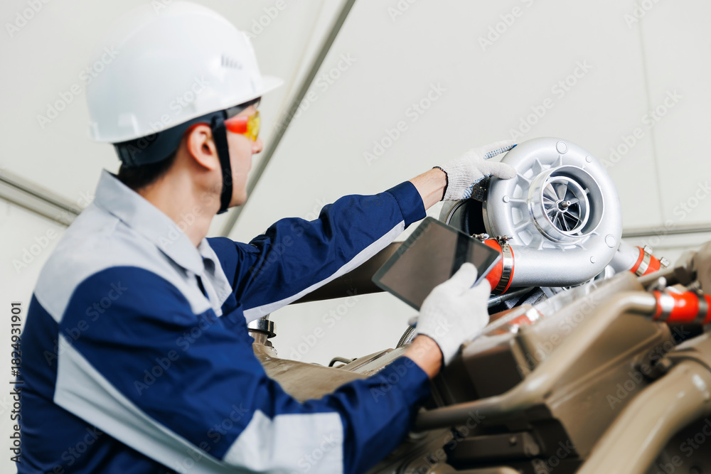 Diagnostics on turbocharged engines of mining truck in garage, Mechanic with tablet computer fix problem