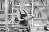 Nice young salesgirl in apron and cap offering cookies in light bakery shop